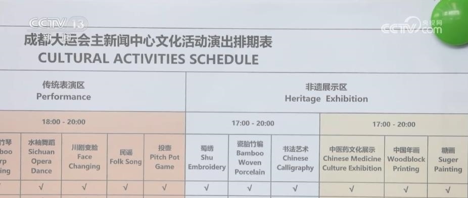為了讓記者在繁忙的新聞報道之余,勞逸結(jié)合、舒緩身心,每天下午5時到晚間,主媒體中心都安排了豐富多彩的非遺文化活動,包括蜀錦蜀繡、川劇變臉、四川竹琴、瓷胎竹編等,讓中外記者感受獨具特色的巴蜀文化。