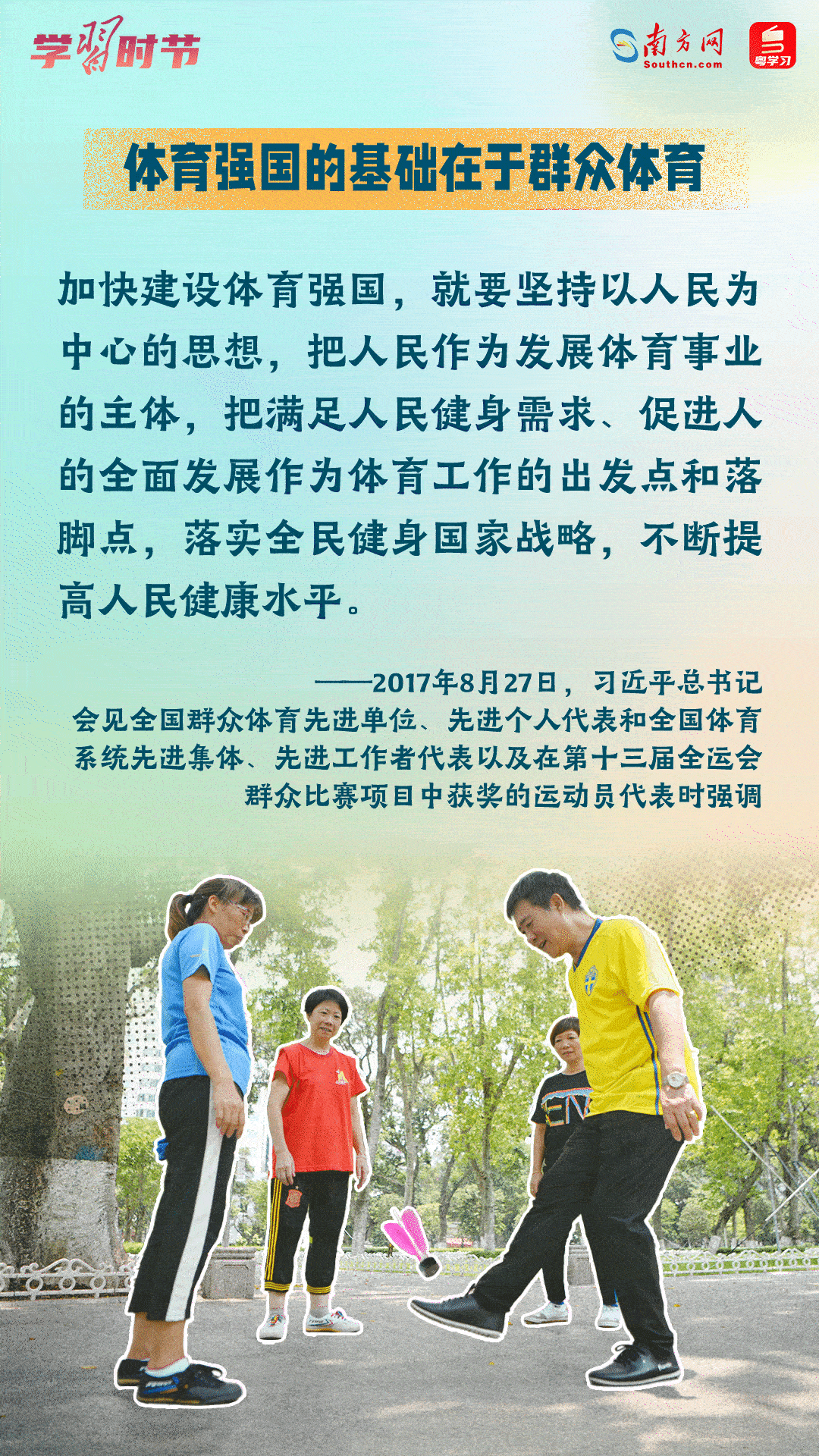 今年8月8日是我國(guó)第15個(gè)“全民健身日”,讓我們學(xué)習(xí)領(lǐng)悟習(xí)近平總書記關(guān)于推進(jìn)全民健身的重要論述,一起加入全民健身的隊(duì)伍中,通過健身收獲健康、收獲快樂!