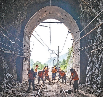 8月7日,北京市門頭溝區(qū)王平鎮(zhèn),中國鐵路北京局北京西工務段工作人員在清理路基和軌道。本報記者 張武軍攝