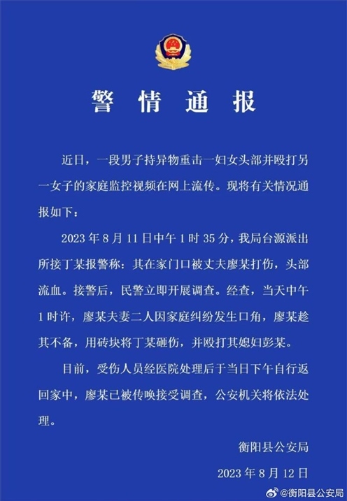 ·男子持磚砸傷妻子并毆打兒媳,湖南衡陽(yáng)警方通報(bào):依法處理。