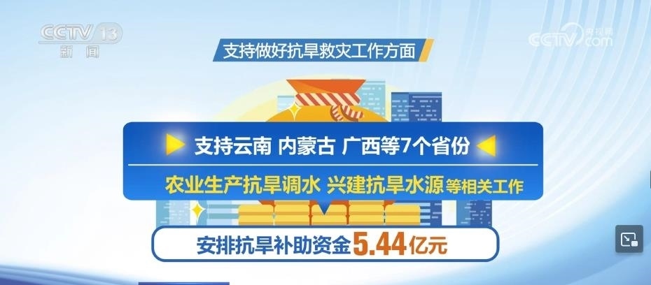 在支持做好抗旱救災工作方面,安排抗旱補助資金5.44億元,支持云南、內蒙古、廣西等7個省份,開展農業(yè)生產抗旱調水、興建抗旱水源等相關工作。 ?