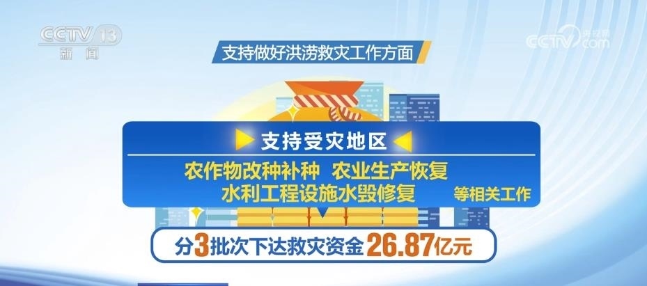 在支持做好洪澇救災工作方面,分3批次下達救災資金26.87億元,支持受災地區(qū)開展農作物改種補種、農業(yè)生產恢復、水利工程設施水毀修復等相關工作。