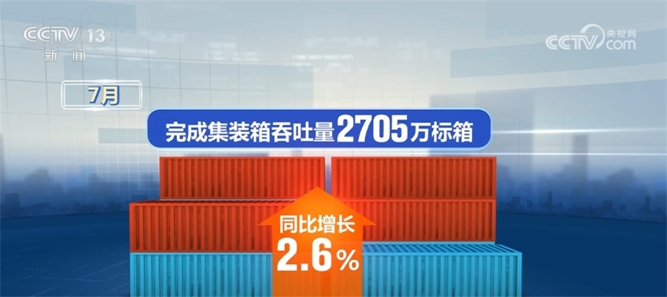 7月,全國(guó)港口貨物吞吐量達(dá)14.3億噸,同比增長(zhǎng)6.6%,其中,內(nèi)、外貿(mào)吞吐量同比分別增長(zhǎng)5.8%和8.5%。完成集裝箱吞吐量2705萬(wàn)標(biāo)箱,同比增長(zhǎng)2.6%。