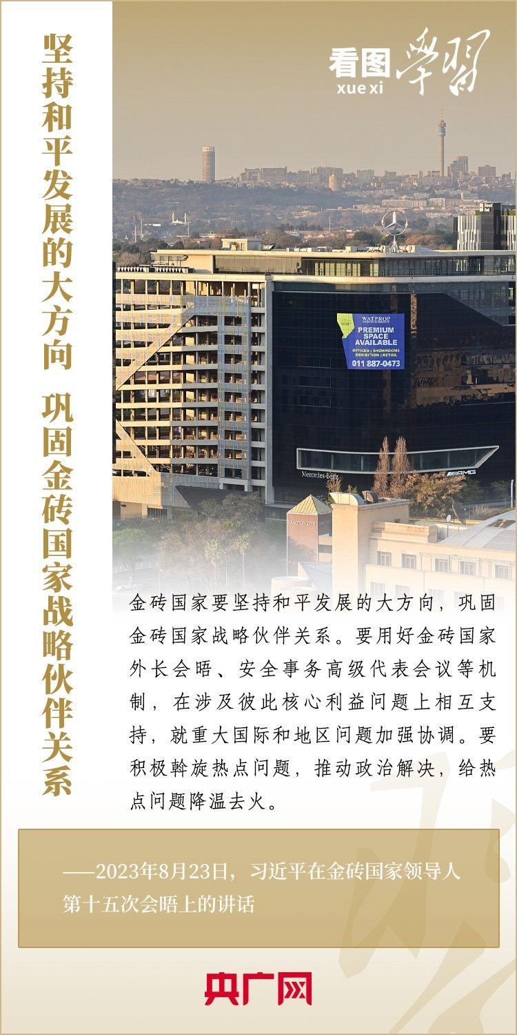 當(dāng)?shù)貢r(shí)間8月23日,習(xí)近平主席出席金磚國家領(lǐng)導(dǎo)人第十五次會(huì)晤并發(fā)表重要講話,強(qiáng)調(diào)金磚國家要秉持開放包容、合作共贏的金磚精神,以金磚責(zé)任應(yīng)對共同挑戰(zhàn),以金磚擔(dān)當(dāng)開創(chuàng)美好未來。一起來學(xué)習(xí)!