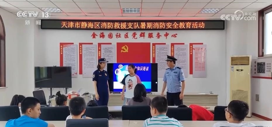 天津公安民警聯(lián)合消防救援人員走進社區(qū),宣傳員叮囑同學們要注意不能到河流、水庫等沒有安全保障的水域洗澡、游泳,并通過真實的案例傳授在遇到困難與危險情況下的自救和求助方法。
