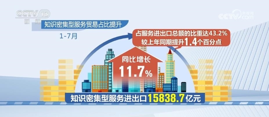 知識密集型服務(wù)貿(mào)易占比提升。1月—7月,知識密集型服務(wù)進出口15838.7億元,同比增長11.7%,占服務(wù)進出口總額的比重達43.2%,較上年同期提升1.4個百分點。