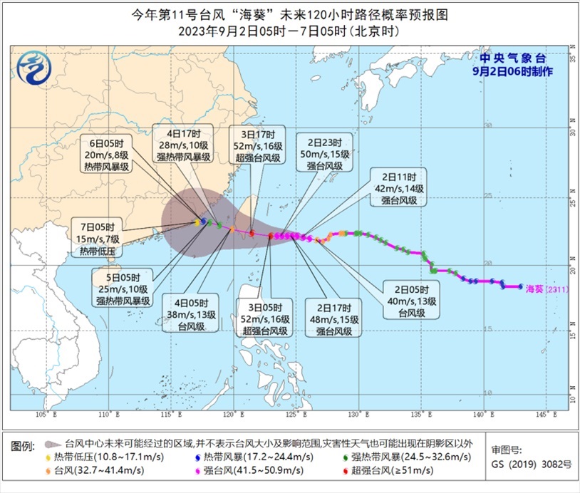 大風(fēng)預(yù)報(bào):9月2日08時(shí)至3日08時(shí),受“蘇拉”影響,南海西北部、北部灣東部、瓊州海峽及廣東沿海、廣西南部沿海、珠江口以及香港和澳門等地將有7-9級、陣風(fēng)10-11級的大風(fēng),“蘇拉”中心經(jīng)過的附近海面或地區(qū)風(fēng)力有12-13級、陣風(fēng)14-15級;受“??庇绊懀?/span>臺灣海峽、浙江南部沿海、福建沿海、廣東東部沿海、臺灣島沿海將有6-7級,陣風(fēng)8級大風(fēng),臺灣以東洋面部分海域風(fēng)力可達(dá)8-10級,陣風(fēng)11-12級,“??敝行慕?jīng)過的附近海面風(fēng)力可達(dá)12-13級,陣風(fēng)14級。