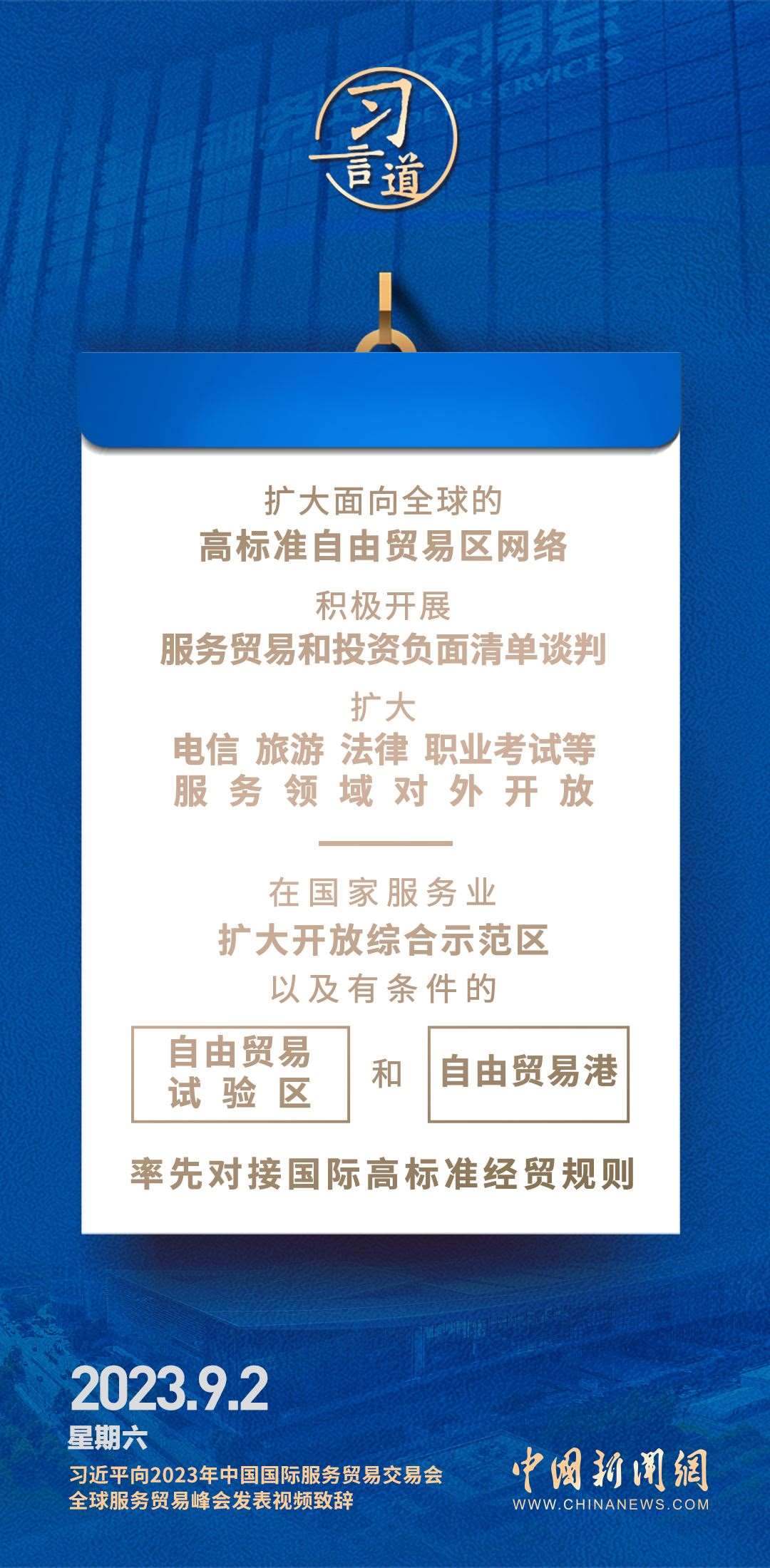 9月2日上午,國家主席習近平在北京向2023年中國國際服務貿(mào)易交易會全球服務貿(mào)易峰會發(fā)表視頻致辭。習近平指出——