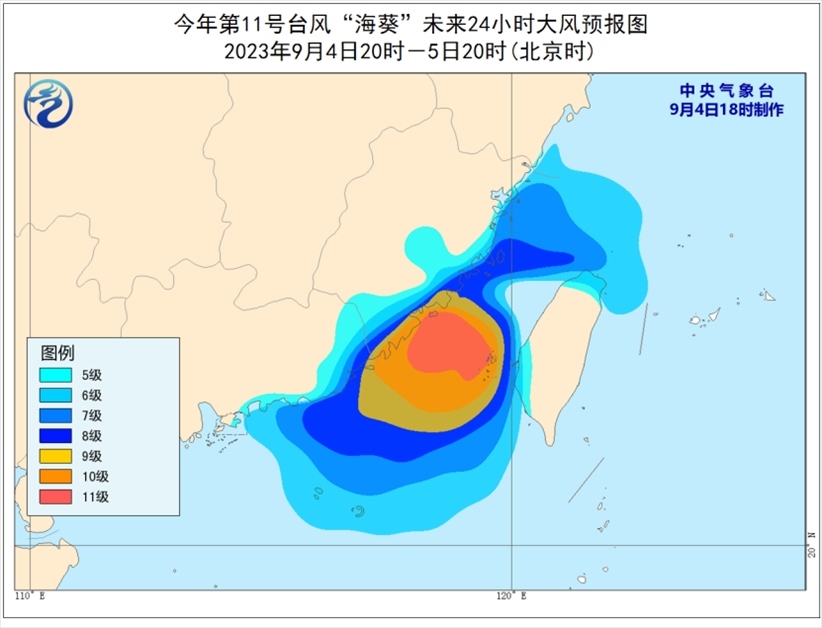 大風(fēng)預(yù)報:9月4日20時至5日20時,臺灣海峽、東海西南部、南海東北部以及福建沿海、廣東中東部沿海、臺灣島西部和北部沿海將有6-8級、陣風(fēng)9-10級大風(fēng),部分海域或地區(qū)的風(fēng)力有9-11級,陣風(fēng)12-13級。