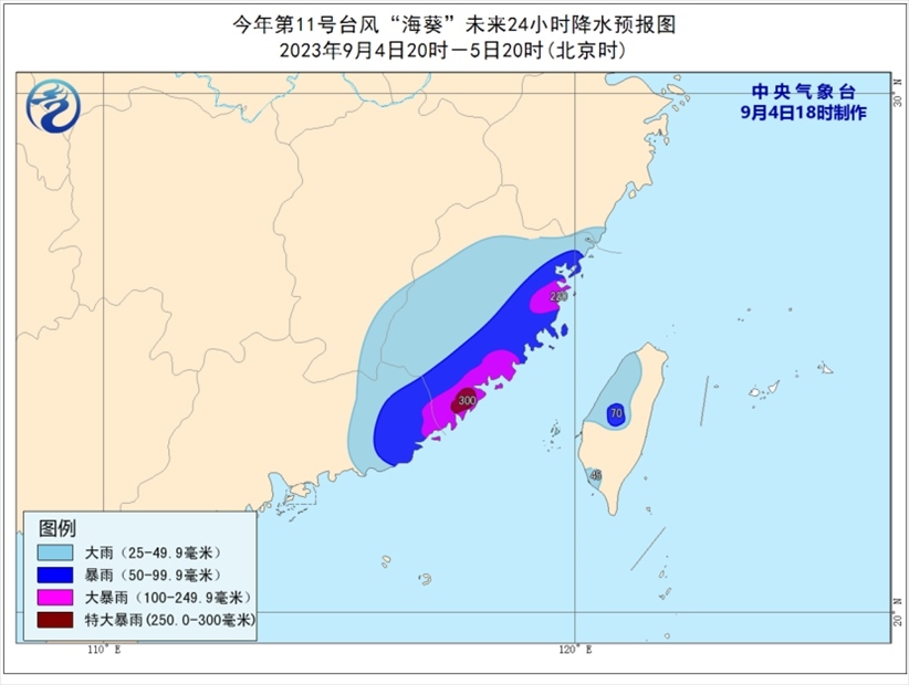 降水預(yù)報:9月4日20時至5日20時,福建大部、廣東東部、江西東南部、浙江東南部、臺灣島西部等地部分地區(qū)有大到暴雨,其中,福建東部、廣東東南部等地部分地區(qū)有大暴雨,局地特大暴雨(250-300毫米)。上述部分地區(qū)伴有短時強降水(最大小時降雨量30-50毫米,局地可超過70毫米),局地有雷暴大風(fēng)等強對流天氣。