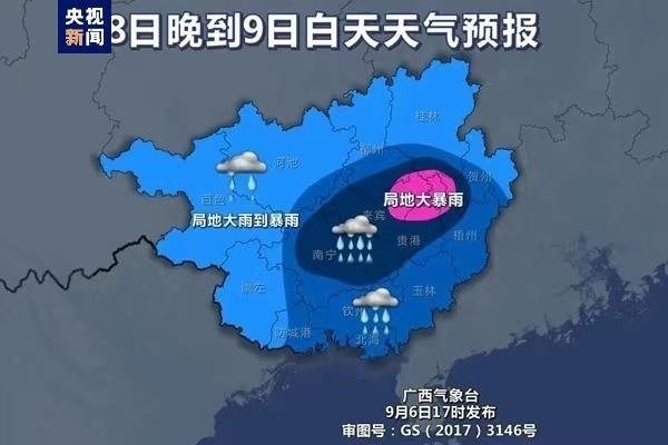 8日晚上到9日白天,南寧、來(lái)賓、貴港、梧州、玉林、北海、欽州、防城港等市和賀州、桂林、柳州三市南部有大雨到暴雨、局地大暴雨,廣西其他地區(qū)有中雨、局地大雨到暴雨。