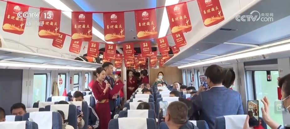 車廂內(nèi)掛滿了國慶主題的旗幟、窗花,“天路格桑花”文藝小分隊(duì)揮動(dòng)著手中的五星紅旗,與旅客齊聲合唱《我和我的祖國》,還表演了詩朗誦、快板等節(jié)目,贏得了現(xiàn)場旅客的掌聲。