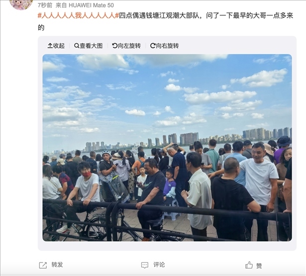 前往浙江錢塘江觀潮的網(wǎng)友發(fā)布消息稱:“四點偶遇錢塘江觀潮大部隊,問了一下最早的大哥一點多來的”。