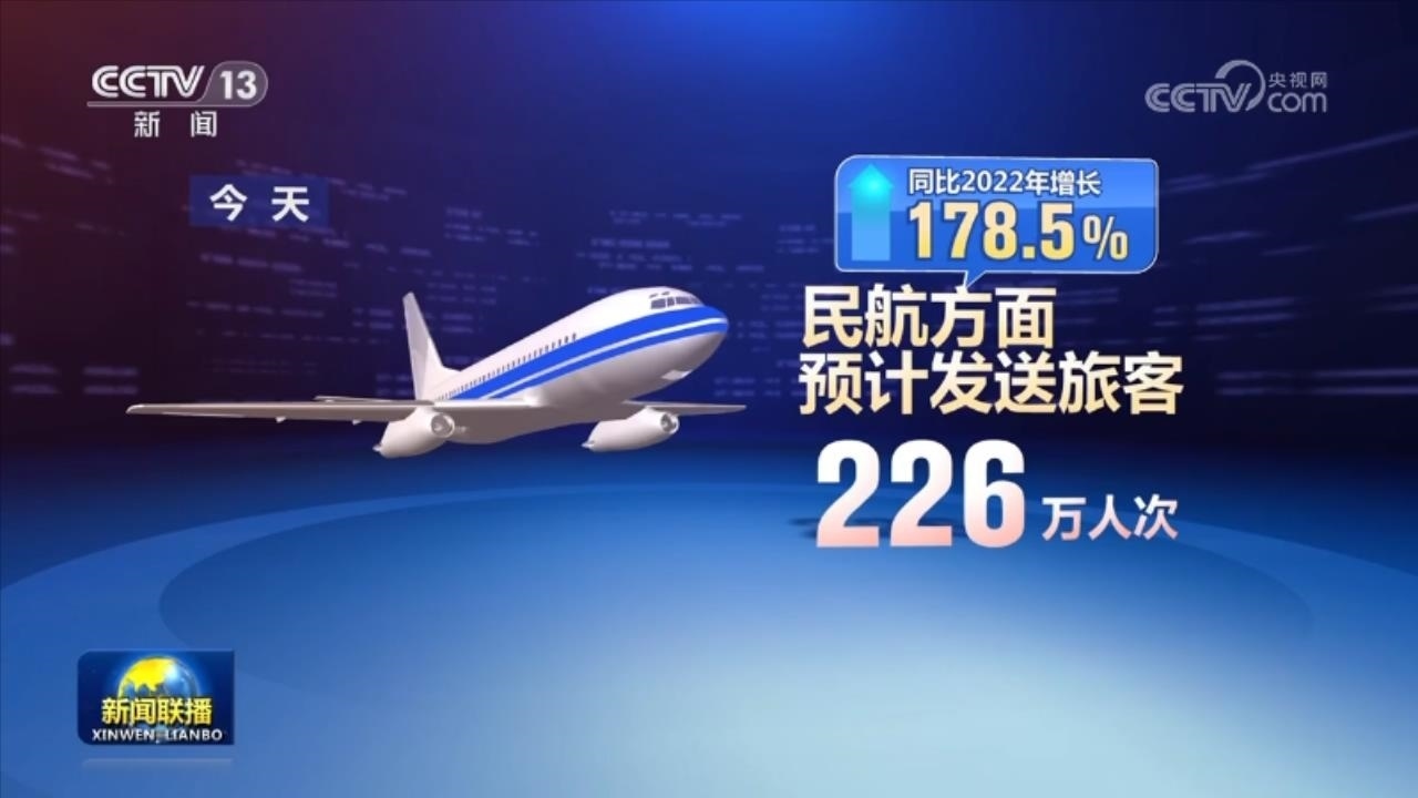 民航方面,今天預(yù)計(jì)發(fā)送旅客226萬人次,同比2022年增長178.5%。全國水路預(yù)計(jì)發(fā)送旅客115萬人次,同比2022年增長164.62%。