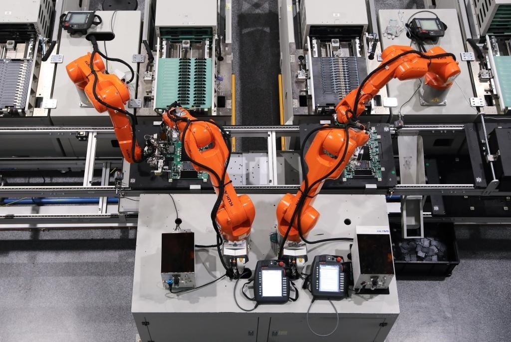 5月22日,在杭州紫光恒越(杭州)技術(shù)有限公司“未來(lái)工廠”,機(jī)械臂在工作中。新華社記者 杜瀟逸 攝