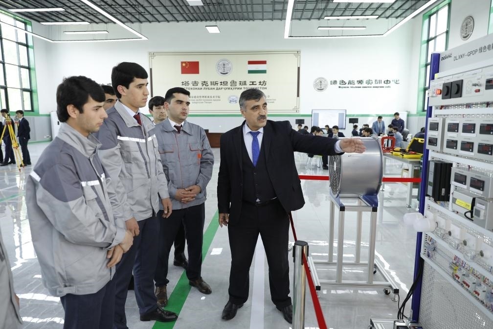 4月12日,在塔吉克斯坦首都杜尚別的魯班工坊內(nèi),塔方教授向學生講解綠色電能展示平臺的功能與使用方法。新華社發(fā)(奧斯帕諾夫攝)