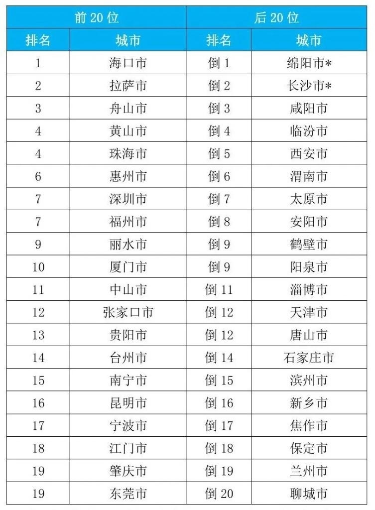 2023年1—9月168個重點城市空氣質(zhì)量排名前20位和后20位城市名單。(圖片來源:生態(tài)環(huán)境部)