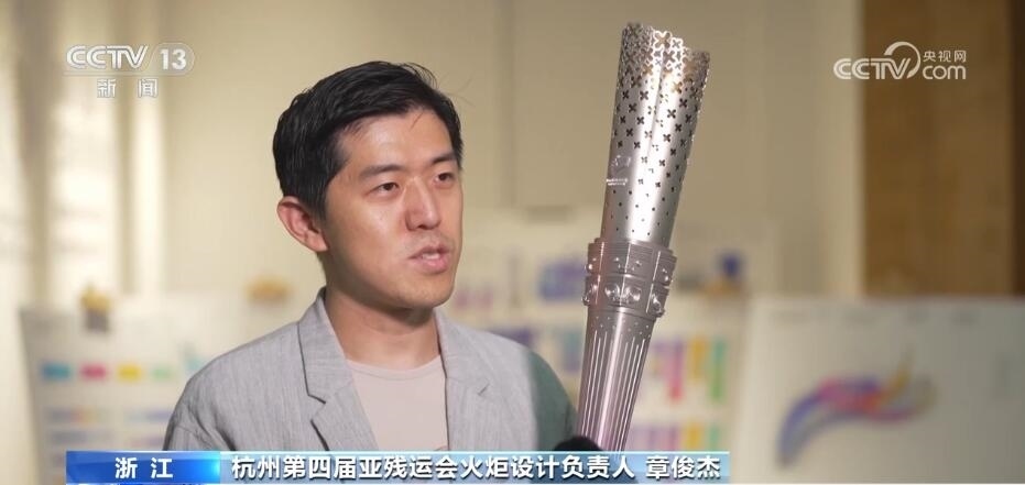 杭州第四屆亞殘運(yùn)會(huì)火炬設(shè)計(jì)負(fù)責(zé)人 章俊杰:玉琮是實(shí)證中華五千年(文明史)的良渚(遺址)文明當(dāng)中的一個(gè)重要禮器,我們把玉琮作為核心意象,外方內(nèi)圓,我們?cè)谂e起火炬的時(shí)候,所有人的視覺(jué)焦點(diǎn)玉琮它承上啟下,分別代表了不同的寓意。承上,我們用點(diǎn)點(diǎn)的星光匯聚成桂花桂冠,可以看到星光越來(lái)越稠密,這是我們希望體現(xiàn)整個(gè)火炬設(shè)計(jì)的積極向上的那種力量感;玉琮往下,在這個(gè)地方設(shè)計(jì)有幾十條的科技線(xiàn),它就好像是綿延著人類(lèi)的歷史和城市科技的脈絡(luò)。