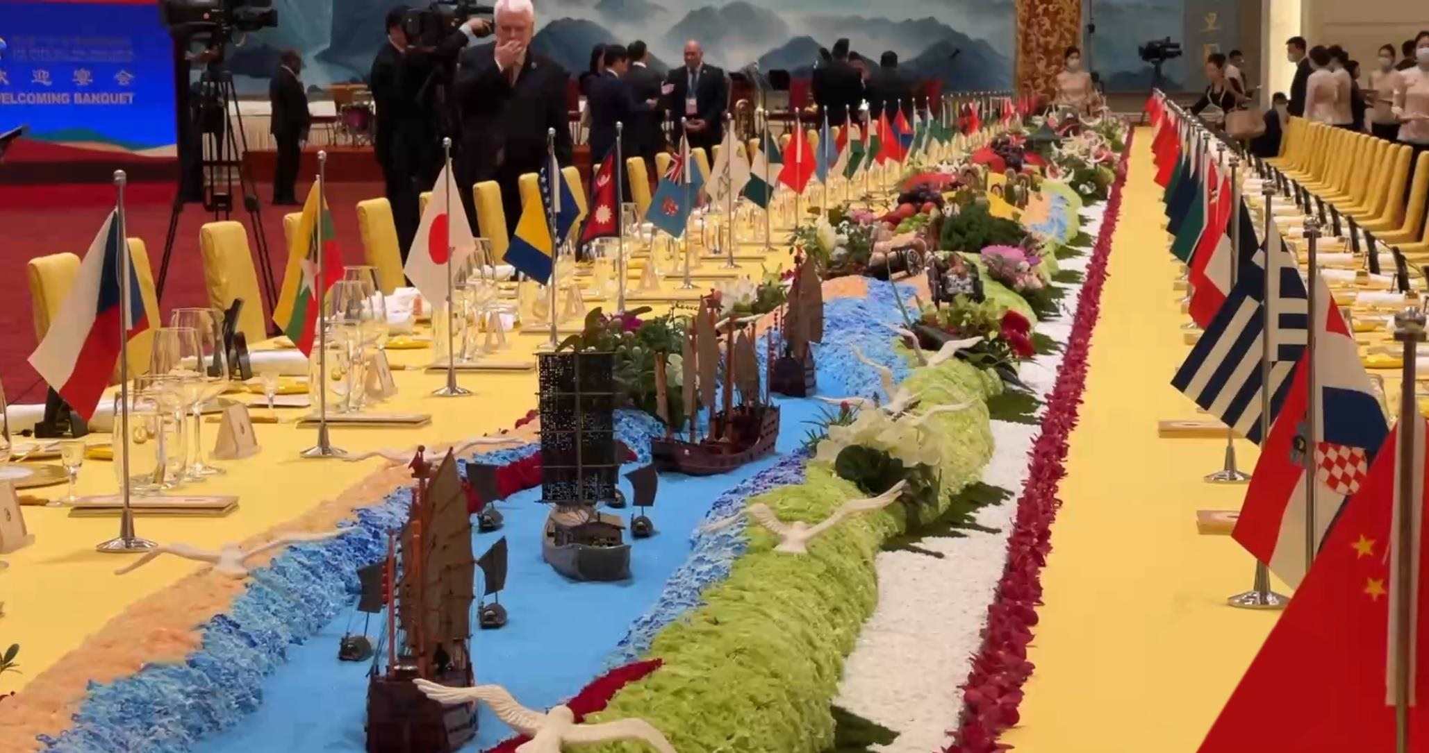 在10月17日晚舉行的歡迎宴會上,嘉賓們被這樣一個(gè)細(xì)節(jié)深深打動——晚宴餐臺以“撫古觀今、擁抱未來”為主題,南側(cè)展示著古代絲綢之路的微觀景象:海邊碼頭上擺放著對外出口的瓷器、絲綢、茶葉等貿(mào)易物資,路上擺放有從西域引進(jìn)的蔬菜瓜果;餐臺北側(cè)為21世紀(jì)絲綢之路的景觀:以北京天壇的裝飾為起點(diǎn),中間穿插高鐵、中歐班列、新能源汽車等擺件,展現(xiàn)各國互聯(lián)互通的景象……