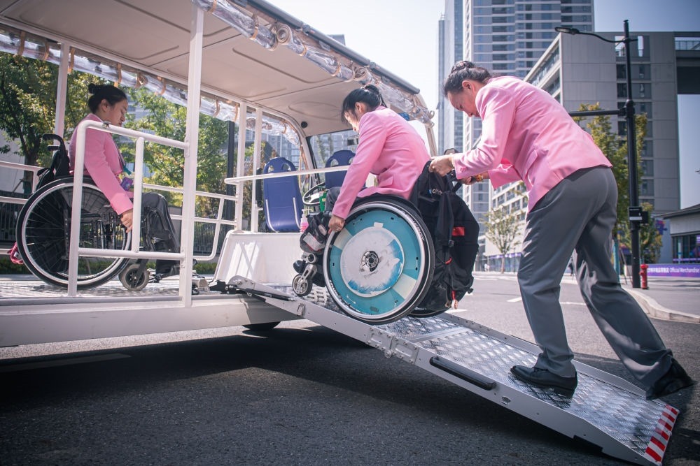 10月16日,中國體育代表團(tuán)成員在杭州亞殘運(yùn)村內(nèi)乘坐無障礙接駁車出行。新華社記者 江漢 攝