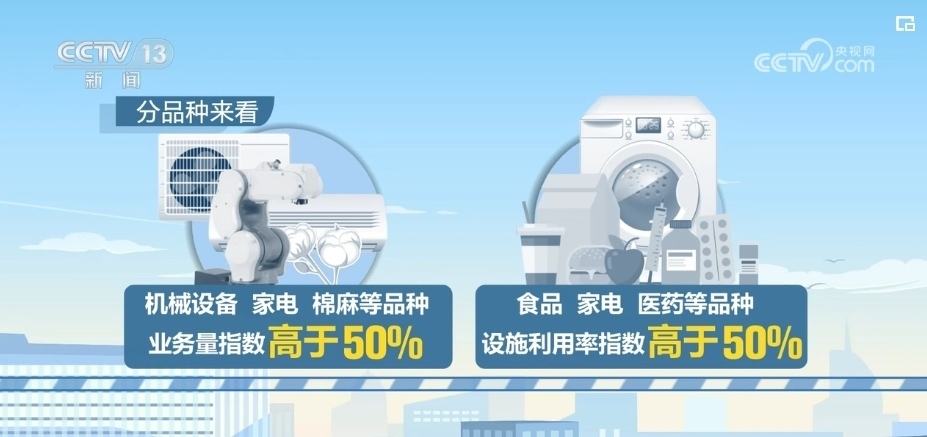 分品種來看,機(jī)械設(shè)備、家電、棉麻等品種的業(yè)務(wù)量指數(shù)高于50%;食品、家電、醫(yī)藥等品種的設(shè)施利用率指數(shù)高于50%。