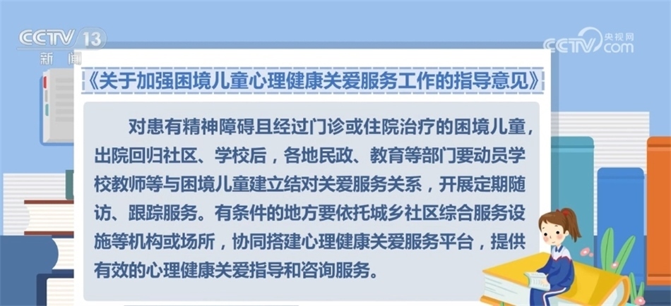 對(duì)患有精神障礙且經(jīng)過(guò)門診或住院治療的困境兒童,出院回歸社區(qū)、學(xué)校后,各地民政、教育等部門要?jiǎng)訂T學(xué)校教師等與困境兒童建立結(jié)對(duì)關(guān)愛(ài)服務(wù)關(guān)系,開(kāi)展定期隨訪、跟蹤服務(wù)。有條件的地方要依托城鄉(xiāng)社區(qū)綜合服務(wù)設(shè)施等機(jī)構(gòu)或場(chǎng)所,協(xié)同搭建心理健康關(guān)愛(ài)服務(wù)平臺(tái),提供有效的心理健康關(guān)愛(ài)指導(dǎo)和咨詢服務(wù)。