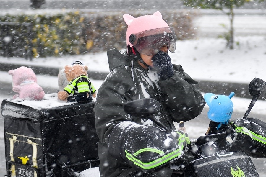 11月6日,外賣員在長(zhǎng)春市延安大街上冒雪配送外賣。新華社記者 顏麟蘊(yùn) 攝
