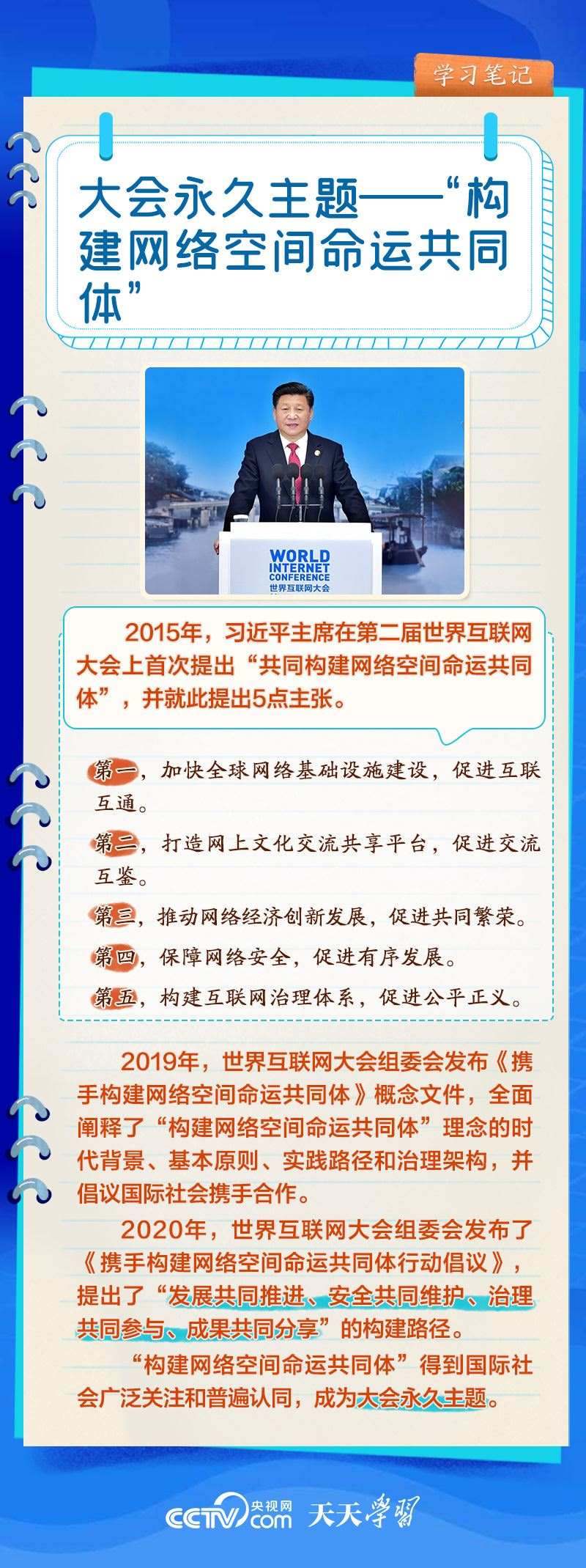 前九屆世界互聯(lián)網(wǎng)大會,習(xí)近平主席或親臨現(xiàn)場發(fā)表主旨演講,或視頻致辭,或向大會發(fā)來賀信,以不同形式關(guān)心大會舉辦。央視網(wǎng)《天天學(xué)習(xí)》欄目推出學(xué)習(xí)筆記,與您一起了解世界互聯(lián)網(wǎng)大會的十年“網(wǎng)”事。