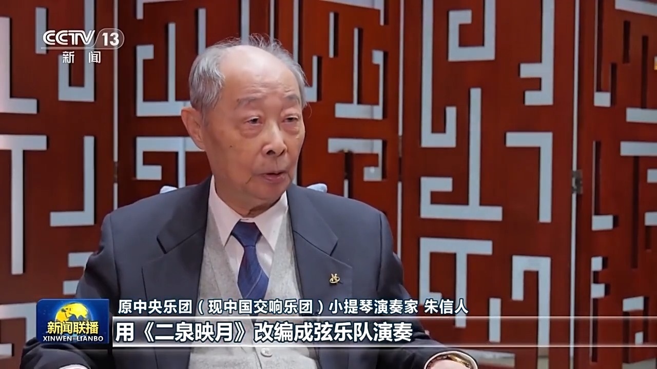 原中央樂(lè)團(tuán)(現(xiàn)中國(guó)交響樂(lè)團(tuán))小提琴演奏家 朱信人:1973年我們是用《二泉映月》改編成弦樂(lè)隊(duì)演奏,他們聽(tīng)了以后非常喜歡這首作品,當(dāng)場(chǎng)就要總譜,他們準(zhǔn)備演。他們也看了我們的樂(lè)器,有的當(dāng)場(chǎng)就把自己的小號(hào)送給我們了。音樂(lè)大家都是融合的。