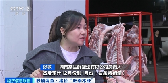 湖南某生鮮配送有限公司負(fù)責(zé)人 張敏:10月份到11月份(每天銷量)是450頭到600頭。預(yù)計(jì)12月份到1月份(白條豬銷量)會(huì)增長到一天800頭到1000頭。