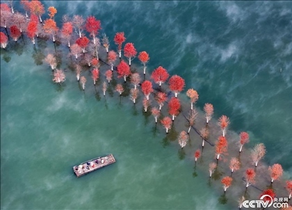 11月14日,初冬時(shí)節(jié),安徽省寧國市方塘鄉(xiāng)青龍灣濕地的紅杉林美如油畫,游客乘坐竹筏在紅杉林中游覽觀光。