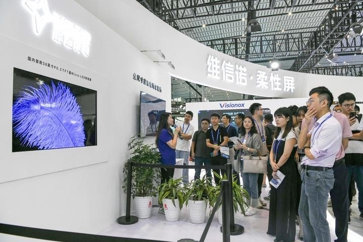 在“2023世界顯示產業(yè)大會新型顯示創(chuàng)新成果展”現(xiàn)場,觀眾在觀看58英寸P0.5TFT基Micro-LED拼接屏(2023年9月7日攝)。新華社記者 唐文豪 攝