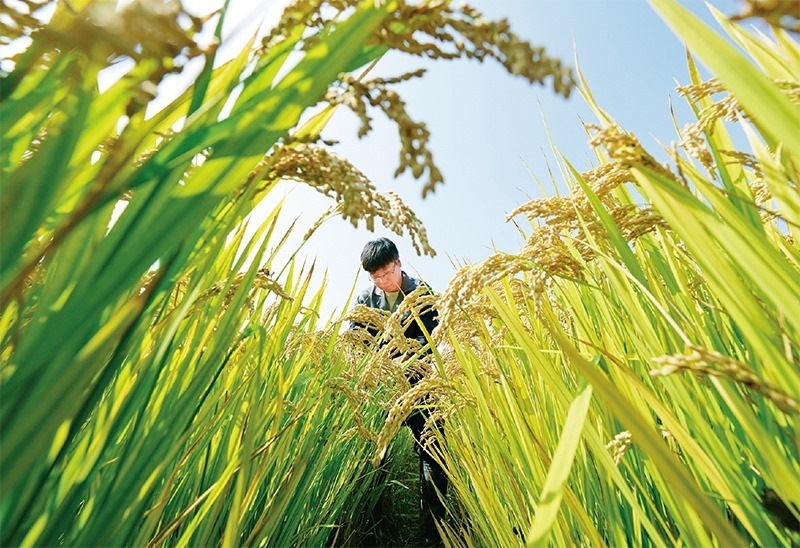 近年來,河北省唐山市通過鹽堿地土壤科學(xué)改良、耐堿作物品種培育、適用耕作技術(shù)研究應(yīng)用等系列治理措施,在鹽堿地上開發(fā)建設(shè)了高標(biāo)準(zhǔn)農(nóng)田88.6萬畝,有效提高鹽堿地利用水平。圖為2023年10月11日,農(nóng)業(yè)科研人員在唐山市曹妃甸區(qū)第五農(nóng)場鹽堿地改良而成的高標(biāo)準(zhǔn)稻田內(nèi)工作。 新華社記者 楊世堯/攝