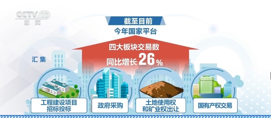 另外,全國公共資源交易平臺上的交易信息匯集發(fā)布量又創(chuàng)新高。截至目前,2023年國家平臺匯集工程建設(shè)項(xiàng)目招標(biāo)投標(biāo)、政府采購、土地使用權(quán)和礦業(yè)權(quán)出讓、國有產(chǎn)權(quán)交易這四大板塊交易數(shù)同比增長26%。