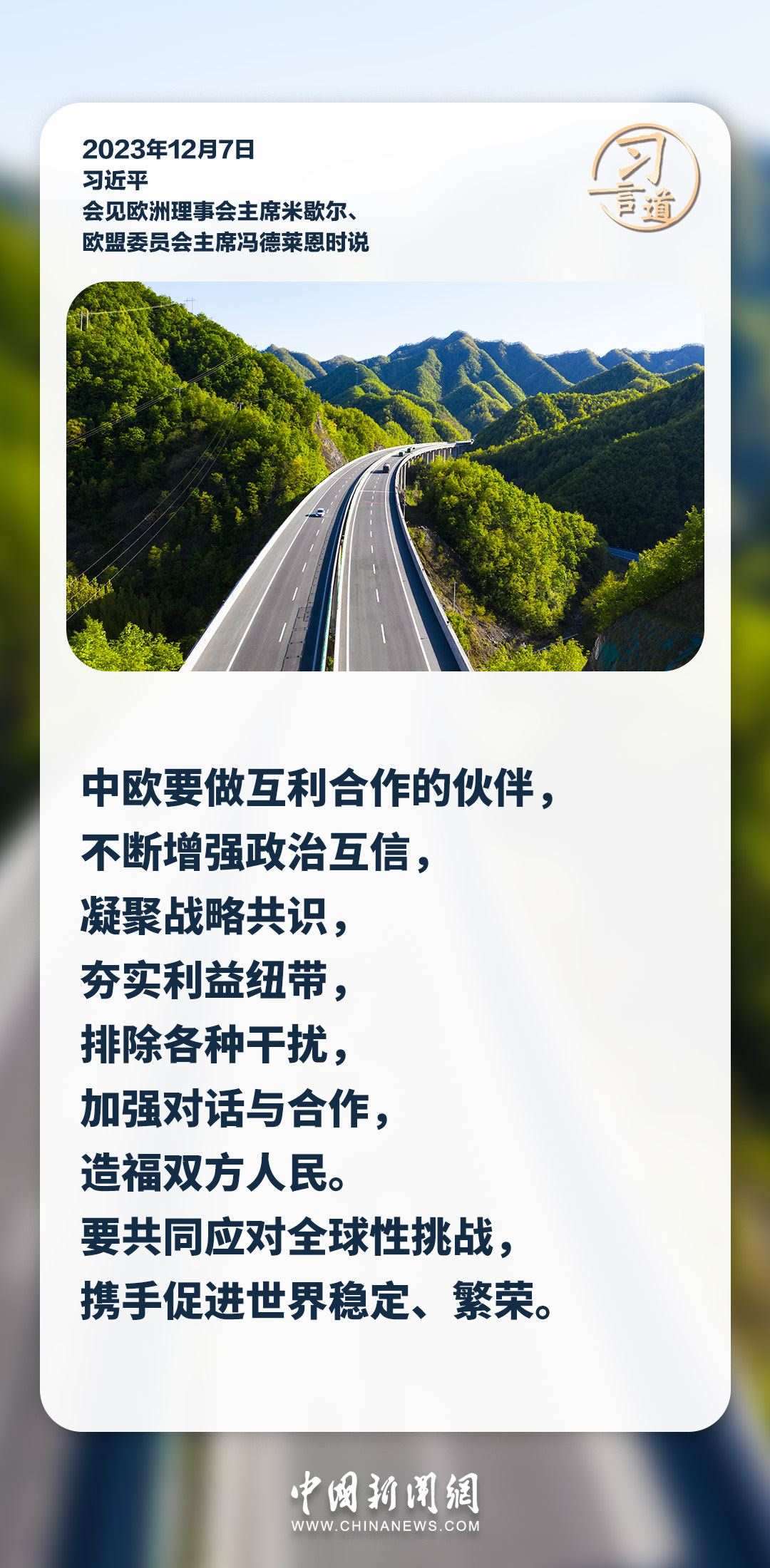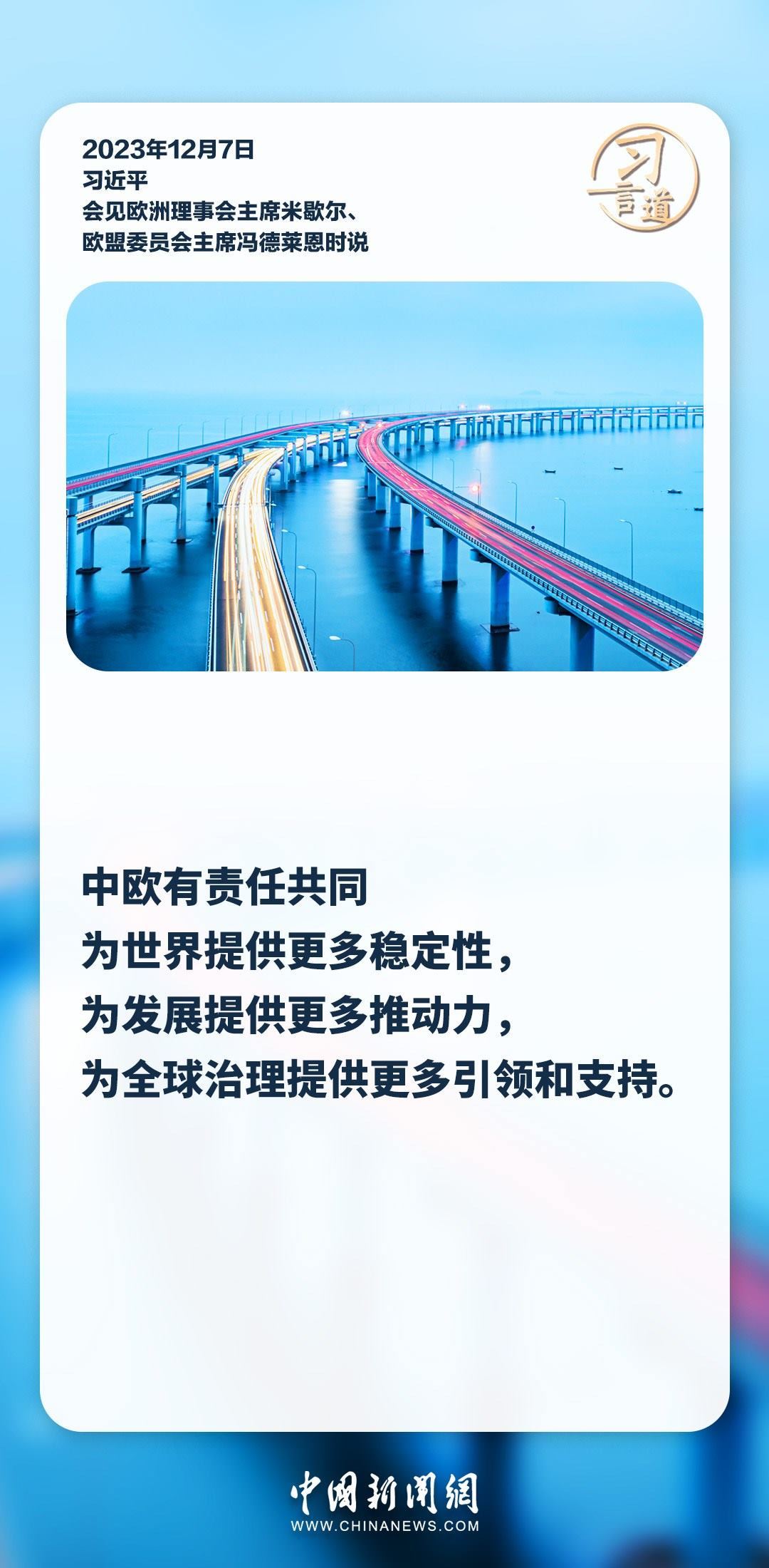 12月7日,國(guó)家主席習(xí)近平在釣魚(yú)臺(tái)國(guó)賓館會(huì)見(jiàn)來(lái)華舉行第二十四次中國(guó)—?dú)W盟領(lǐng)導(dǎo)人會(huì)晤的歐洲理事會(huì)主席米歇爾和歐盟委員會(huì)主席馮德萊恩。習(xí)近平說(shuō)——