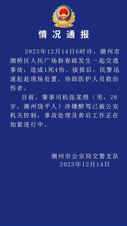 ·廣東潮州一男子涉嫌醉駕致1死4傷,警方通報:肇事司機(jī)已被控制。