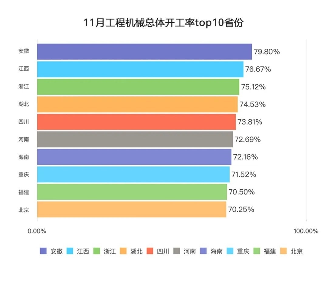 11月,安徽、河南、湖北各有7類設(shè)備平均作業(yè)量同比增長,江西有3類設(shè)備平均作業(yè)量同比增長,主要集中在汽車起重機、履帶起重機、挖掘機。
