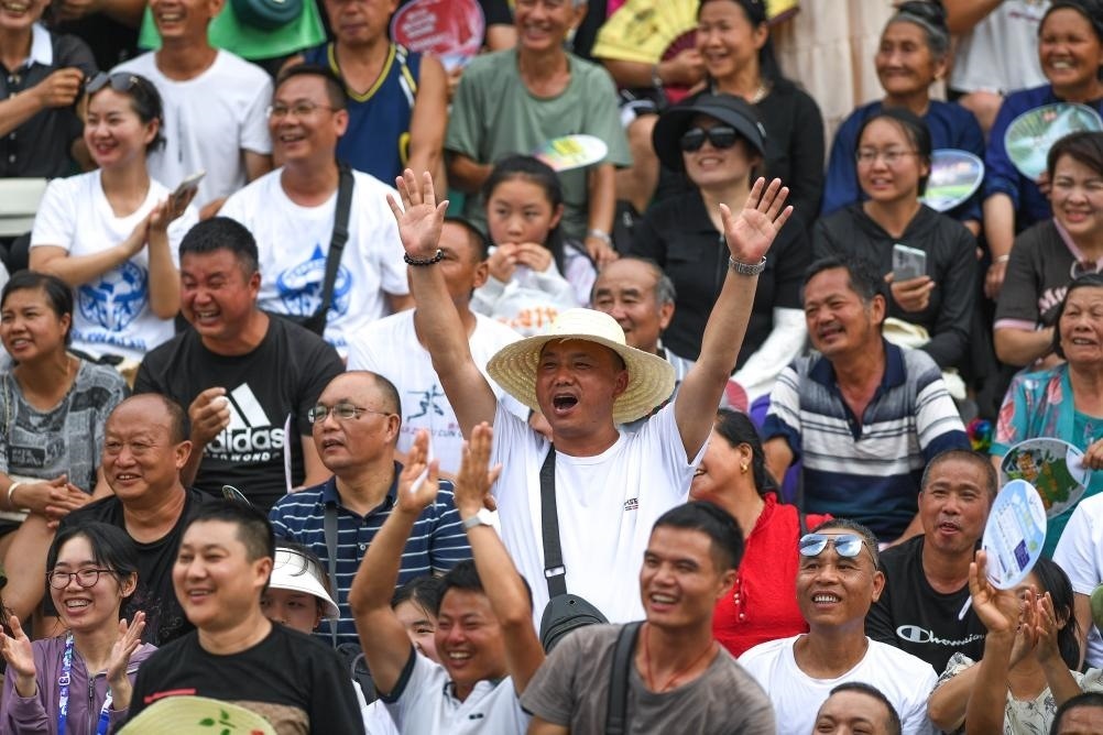 7月29日,觀眾在貴州榕江(三寶侗寨)和美鄉(xiāng)村足球超級(jí)聯(lián)賽年度總決賽的現(xiàn)場(chǎng)歡呼。新華社記者 楊文斌 攝