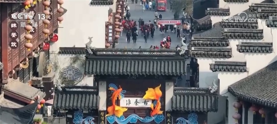 ??????新年將至,南京秦淮河畔的各式花燈陸續(xù)落成,與古建筑相互映襯。碧水繞城,畫舫穿行,裝扮后的古城如畫如詩。在“古秦淮”的牌坊上,魚躍龍門的造型立體生動。人們穿過牌坊,采買年貨,拍照留念。在夫子廟南側(cè)的門東歷史文化街區(qū),一條大龍?jiān)煨偷幕粢莱菈Χ?。十二生肖燈組活靈活現(xiàn),讓古樸的街巷增添了迎新的色彩。