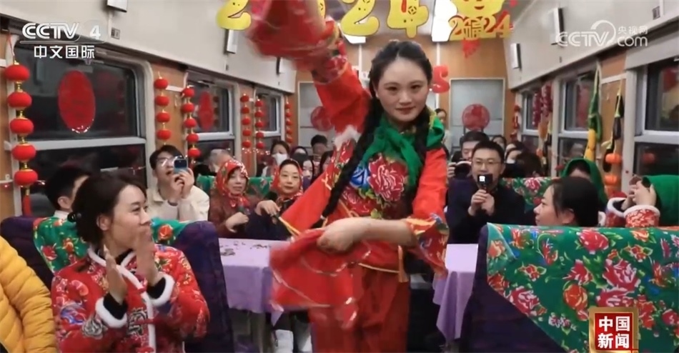 總臺(tái)央視記者 楊曜語(yǔ):我即將登上的列車(chē)就是從哈爾濱開(kāi)往漠河的國(guó)內(nèi)首個(gè)沉浸式東北民俗文化體驗(yàn)列車(chē),坐過(guò)的人都說(shuō)一上車(chē)就想盤(pán)腿兒了,我們趕緊來(lái)體驗(yàn)一下!一上車(chē)我就被濃濃的東北文化所感染到了,整個(gè)車(chē)廂都被東北大花的經(jīng)典配色裝飾著,再加上隨手就能品嘗到東北特色美食,坐在床鋪上就感覺(jué)一秒鐘“穿越”到農(nóng)家炕頭。