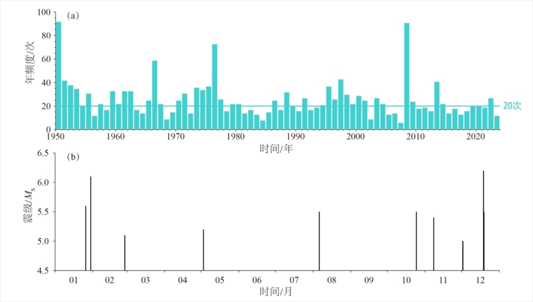 2023年以來(lái)大陸地區(qū)發(fā)生5級(jí)以上地震11次,最大為12月18日甘肅積石山6.2級(jí)地震,活動(dòng)水平較2022年(27次,最大為2022年1月8日青海門(mén)源6.9級(jí)地震)和歷史平均水平(20次)明顯偏弱(圖a)。2023年5級(jí)以上地震時(shí)間分布不均勻,1月至2月發(fā)生3次,3月至9月僅發(fā)生2次,10月至12月增至6次,出現(xiàn)5級(jí)以上地震由弱轉(zhuǎn)強(qiáng)的活動(dòng)特征(圖b)。