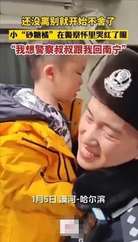 1月5日,從漠河回哈爾濱的雪國(guó)列車上,有位“砂糖橘殿下”邊哭邊抱著警察叔叔不撒手,“我想警察叔叔跟我回南寧?!眮?lái)自東北警察叔叔的愛(ài),一定是最最暖的吧!