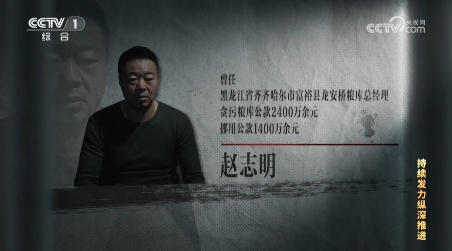 【解說詞】趙志明曾是黑龍江省齊齊哈爾市富裕縣龍安橋糧庫總經(jīng)理,經(jīng)查,他貪污糧庫公款2400萬余元,挪用公款1400萬余元,2023年3月被判處有期徒刑14年。龍安橋糧庫是在2015年由5家國有糧庫改革重組的,富??h政府持股51%、民營企業(yè)鼎倉公司持股49%。趙志明原本是鼎倉公司的老板,在這次改制中當上了龍安橋糧庫總經(jīng)理。