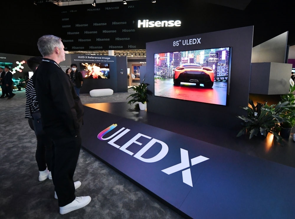 2023年9月1日,參觀者在德國(guó)柏林國(guó)際消費(fèi)電子展海信展區(qū)觀看ULED X參考級(jí)影像電視。新華社記者 任鵬飛 攝