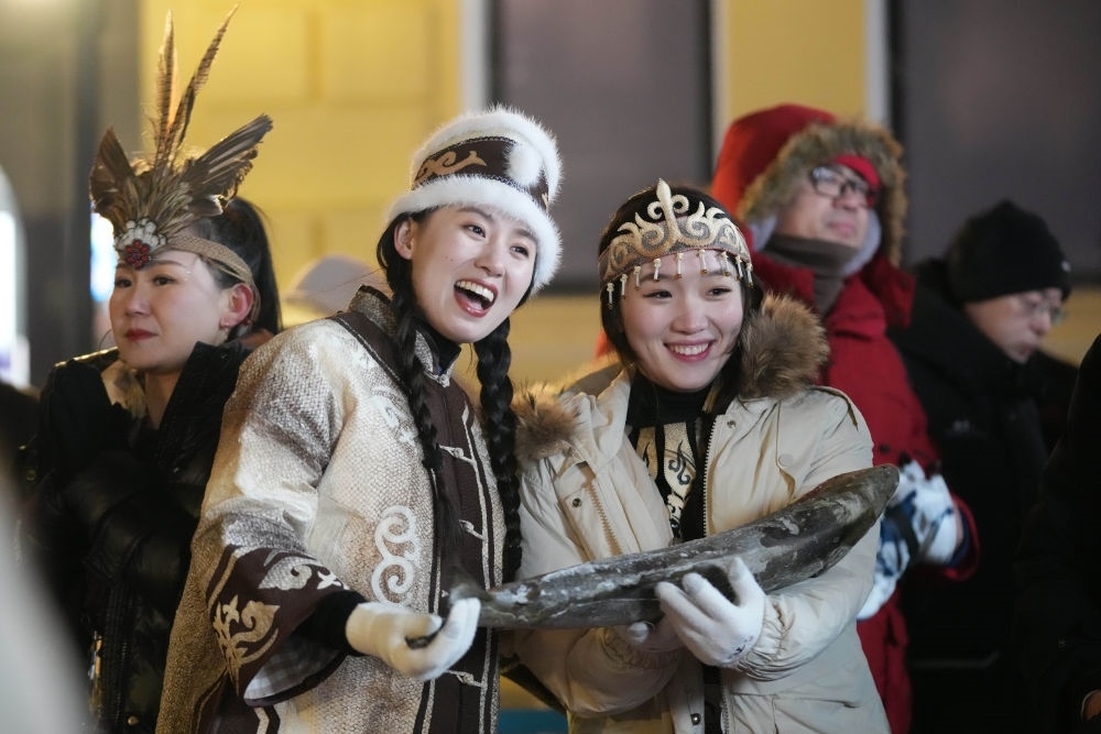 ↑1月6日,身著赫哲族服飾的赫哲族群眾在哈爾濱中央大街上與游客互動。