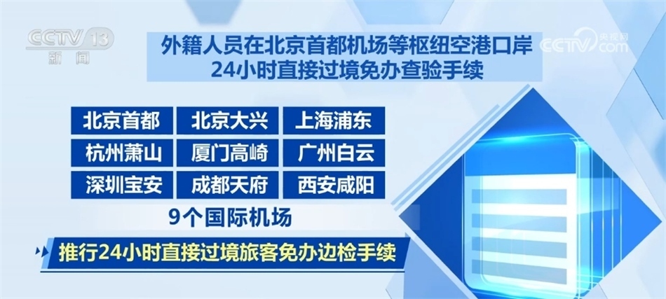 外籍人員在北京首都機(jī)場(chǎng)等樞紐空港口岸24小時(shí)直接過境免辦查驗(yàn)手續(xù)。在北京首都、北京大興、上海浦東、杭州蕭山、廈門高崎、廣州白云、深圳寶安、成都天府、西安咸陽9個(gè)國(guó)際機(jī)場(chǎng),推行24小時(shí)直接過境旅客免辦邊檢手續(xù)。對(duì)于持24小時(shí)內(nèi)國(guó)際聯(lián)程機(jī)票,經(jīng)上述任一機(jī)場(chǎng)過境前往第三國(guó)或地區(qū)的出入境旅客,可以免辦邊檢手續(xù),直接免簽過境。