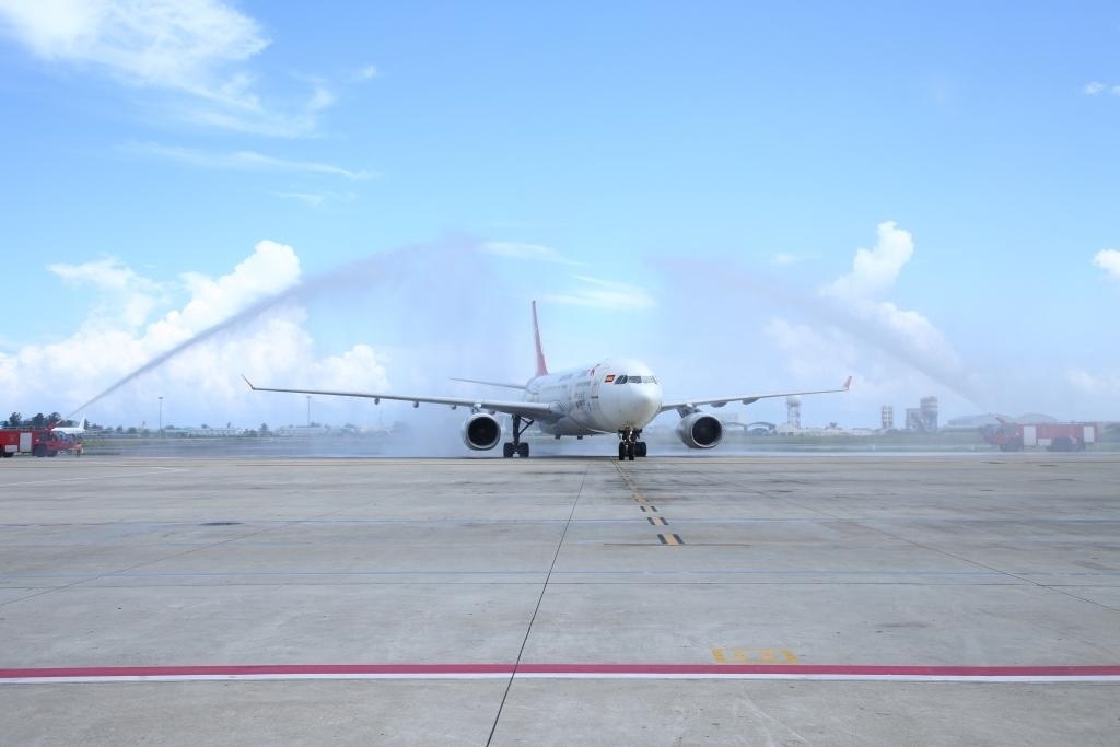 2023年1月18日,中國首都航空JD455航班在馬爾代夫馬累維拉納國際機場接受水門禮。