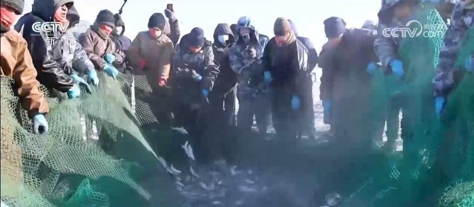 在克什克騰旗達(dá)里湖現(xiàn)場,人工鑿冰、冰下走網(wǎng),冬捕隊員在作業(yè)時選用5公分網(wǎng)眼,這樣捕魚時就能漏掉小魚。馬拉絞盤將大網(wǎng)拖拽出網(wǎng)口,滿載魚兒的漁網(wǎng)慢慢地從湖水中出來,游客們感受豐收的喜悅。