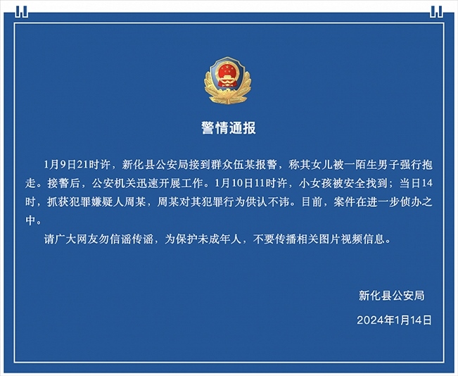 ·網(wǎng)傳湖南一女童在樓道被男子強行抱走?警方通報:犯罪嫌疑人已被抓獲。