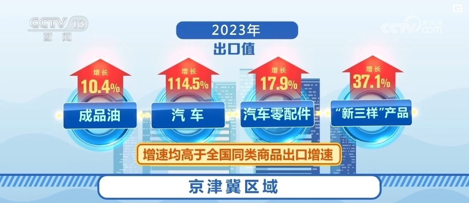 出口方面,2023年京津冀區(qū)域出口1.31萬億元,增長2.5%,占全國出口總值的5.5%。其中,成品油、汽車、汽車零配件、“新三樣”產(chǎn)品出口值分別增長10.4%、114.5%、17.9%、37.1%,增速均高于全國同類商品出口增速。成品油出口量、出口值占全國成品油出口總量、出口總值的一半以上。